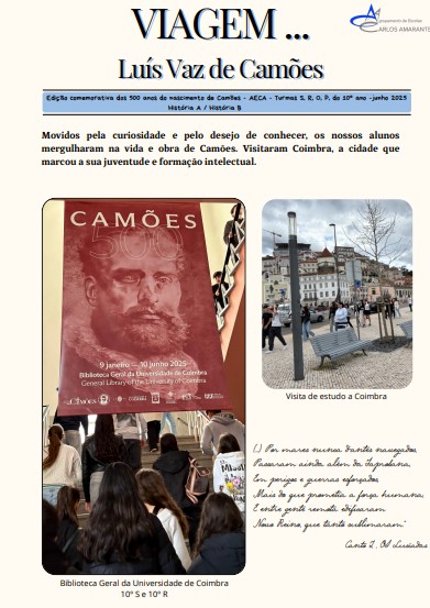 Esta iniciativa foi dinamizada pela PB da biblioteca escolar em articulação com os professores de História e de Português das turmas envolvidas. Os alunos tiveram a oportunidade de ouvir a autora a falar sobre a obra 'Fortuna, Caso, Tempo e Sorte - biografia de Luís Vaz de Camões', que leram excertos, com o objetivo de conhecerem a biografia do autor, analisarem a lírica e épica camoniana e elaborarem o jornal: "Viagem... Luís Vaz de Camões"